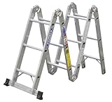 The Werner 8-foot Type1 250-pound duty rating aluminum multi-master articulated ladder includes a three-position multi-lok hinge that can create 18 different positions or applications. It can turn into a double stepladder, stepladder, stairwell ladder, stand-off ladder, fully extended straight ladder, 1/2 and 3/4-length straight ladder, self-supporting scaffold, extended span scaffold, stairwell scaffold, and others. The slip-resistant multi-directional rungs are complemented by slip-resistant feet; the ladder's bolt-on base provides stability, while the Alflo rung joint connections prevent twisting.